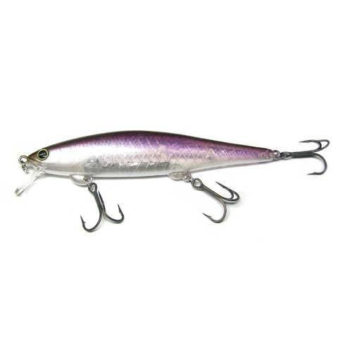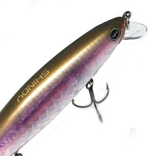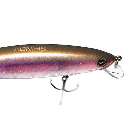 SHINDY 110 SF-M (シンディ110SF-M) M Lip 潜行深度 1.5m Length:110mm Weight:15g Type:SlowFloating SHINDY 110SFはフラット気味で体高のある形状で、全長110mm/3フック仕様ジャークベイト。 体高のあるフラット気味なボディに肉厚を抑え内部構造のパーツと樹脂を極限まで減らし空気室の体積を稼ぐ設計。 ボディ下部に沿ってセットされた専用設計の固定ウェイトにより低重心化を実現。 優れたアクションレスポンスで巻き始めからの立ち上がりも素早く、ロッド操作の小さな入力をアクションに変換するそのレスポンスは秀逸です。 まるでノーシンカーのソフトジャークベイトを操作しているかの様な軽快さと小気味よさは操作する楽しさを感じていただけるでしょう。