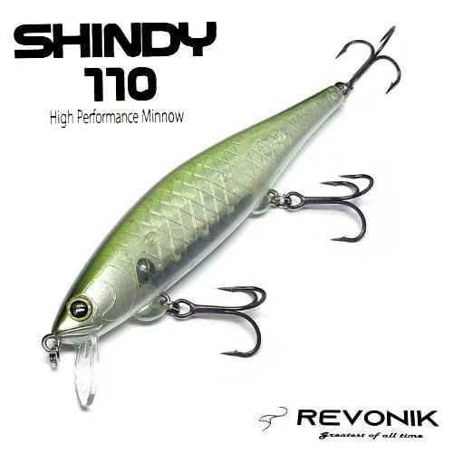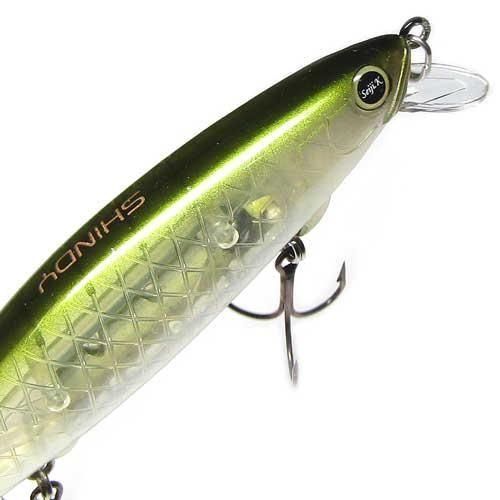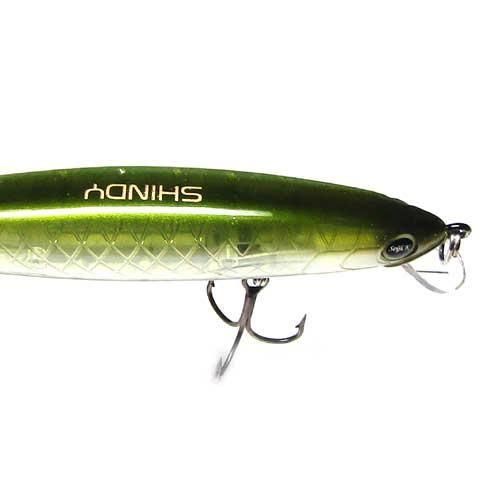 SHINDY 110SFはフラット気味で体高のある形状で、全長110mm/3フック仕様ジャークベイト。