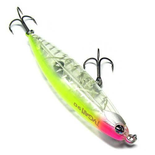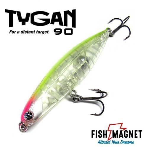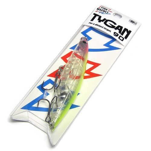 TYGAN 90 (タイガン90) Length:90mm Weight:14g Type:Floating Hook:#4 (Ring#3) ・推奨タックル Rod:6.5~7.3ft MLクラス Reel:HGクラスベイトリール LINE:PE2~3号 + Leader フロロカーボン16~20lb 対岸までブッ飛ぶペンシルベイト TYGAN 90 FISH MAGNET 第1弾PRODUCTS秦拓馬が自身のルアーブランドFISH MAGNETを立ち上げるにあたり最も重要視したのが「自分でルアーを操作して魚を釣る」というルアーフィッシング最大の醍醐味の再認識。 「投げて楽しい」「操作して楽しい」「狙って釣れて嬉しい」その想いの第1弾として形にしたのがこのTYGAN 90です。 開発当初は100mmで削り出し、90mm or 115mmという構想でスタートしました。 圧倒的飛距離を可能にしたボディ形状とウェイト配置誰でも気持ちよく投げられて遠くに正確に飛ばせる。 飛んだ先でもレスポンス良いアクションで、魚と出会う確率を1%でも上げる”このTYGANの持つ最大の能力として最も重要視したのが『圧倒的飛距離』です。 本体の形状は先頭、後尾ともに滑らかな曲線かつ尖った形状で空気抵抗を最大限軽減し、後方のウェイトルーム設計は着水姿勢やアクションとのバランスを保ちながら可能な限り後方重心に設定しました。 フラット面で叩いて鳴らす音とドーム型の泡ペンシルベイトとして重要なドッグウォークアクション。 ボディ側面は前方部がフラット形状、後方部はラウンド形状となっておりアクション入力時、前方部のフラット面で水面を叩くことによってスプラッシュとポップ音が混ざった絶妙な音を奏でます。 その証としてドッグウォーク時にはドーム状の泡が発生します。 また本体のお腹部分のフラット形状でダート幅の抑制もしておりこのショートターンと、まるで楽器を奏でるかのようなサウンドで強くアピールするTYGAN特有のアクションが実現可能となりました。