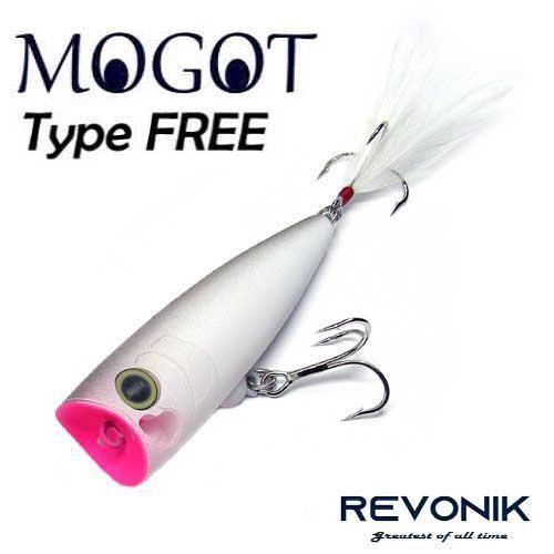 MOGOT (モゴット) TypeFREE Length:68mm Weight:7.5g Type:Floating Revonikがアクションレスポンスの向上のために取り組む薄肉コンセプト。Dot SIXやSHINDY Saramoaなどでそのメリットは実証されていますが、最新作のMOGOTにも継承されています。 本体のシェル(成形品)や内部のウエイトルームなどを見直し樹脂量を減らす工夫が盛り込まれています。 例えば、顔に彫り込まれたホール部。一見するとフロントのカップから水流が抜けることを狙った様に見えますが、これは構造上の問題で肉厚になりがちなカップ付近の樹脂量を減らすための設計です。強度とアクションを保ちながらも様々な部分を見直しました。 大同小異のポッパーというルアーに経験から培われたコンセプトと技術を盛り込んだのがMOGOTなのです。 ●FREE ボディ内部の大型ウエイトが前後左右に自由に移動し、浮き角度が変化するマニュアル仕様。着水直後はテール下がりの立ち浮きですが、アクションを始めると前方に移動して横浮きに変化することで移動距離を抑えるドッグウォークから広い範囲をテンポよくスプラッシュを上げて誘うストップ&ゴーまでカバーします。アングラーのスキルに合わせて様々な使い方が出来ますので、ぜひそのポテンシャルをお楽しみください。 ●POP&DOG(立ち浮き) 内部ウエイトの移動範囲を中央〜後部に設定した立ち浮き姿勢。アクションが安定しポップ音が出しやすく、軽快なドッグウォークが可能なオートマチック仕様です。もちろん、慣れればFREEのように断続的なスプラッシュを上げてのアクションも!。