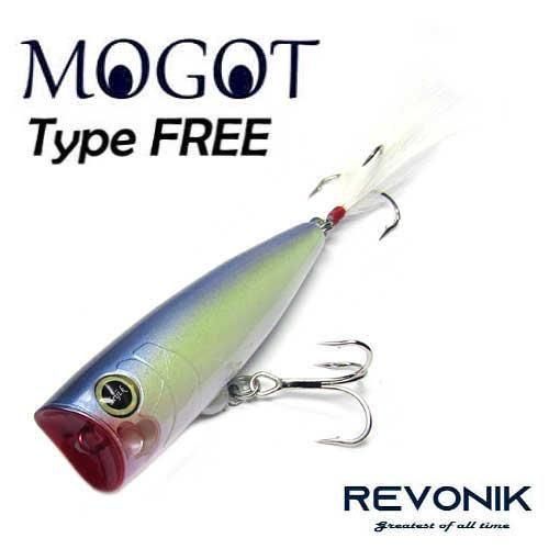 MOGOT (モゴット) TypeFREE Length:68mm Weight:7.5g Type:Floating Revonikがアクションレスポンスの向上のために取り組む薄肉コンセプト。Dot SIXやSHINDY Saramoaなどでそのメリットは実証されていますが、最新作のMOGOTにも継承されています。 本体のシェル(成形品)や内部のウエイトルームなどを見直し樹脂量を減らす工夫が盛り込まれています。 例えば、顔に彫り込まれたホール部。一見するとフロントのカップから水流が抜けることを狙った様に見えますが、これは構造上の問題で肉厚になりがちなカップ付近の樹脂量を減らすための設計です。強度とアクションを保ちながらも様々な部分を見直しました。 大同小異のポッパーというルアーに経験から培われたコンセプトと技術を盛り込んだのがMOGOTなのです。 ●FREE ボディ内部の大型ウエイトが前後左右に自由に移動し、浮き角度が変化するマニュアル仕様。着水直後はテール下がりの立ち浮きですが、アクションを始めると前方に移動して横浮きに変化することで移動距離を抑えるドッグウォークから広い範囲をテンポよくスプラッシュを上げて誘うストップ&ゴーまでカバーします。アングラーのスキルに合わせて様々な使い方が出来ますので、ぜひそのポテンシャルをお楽しみください。 ●POP&DOG(立ち浮き) 内部ウエイトの移動範囲を中央〜後部に設定した立ち浮き姿勢。アクションが安定しポップ音が出しやすく、軽快なドッグウォークが可能なオートマチック仕様です。もちろん、慣れればFREEのように断続的なスプラッシュを上げてのアクションも!。